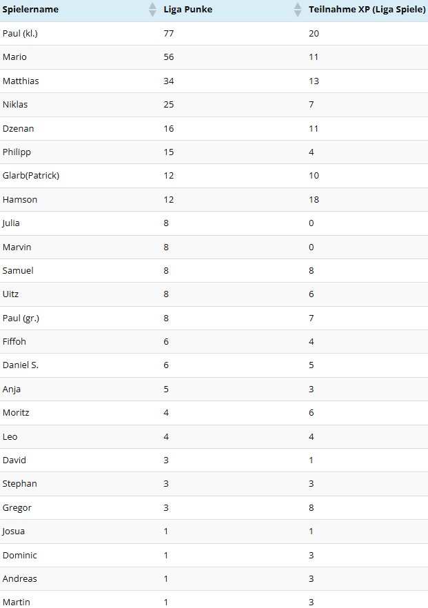 | Spielername | Liga S6 Punke | Teilnahme XP (Liga 5-10) |