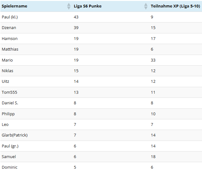 | Spielername | Liga S8 Punke | Teilnahme XP (Liga 5-10) |