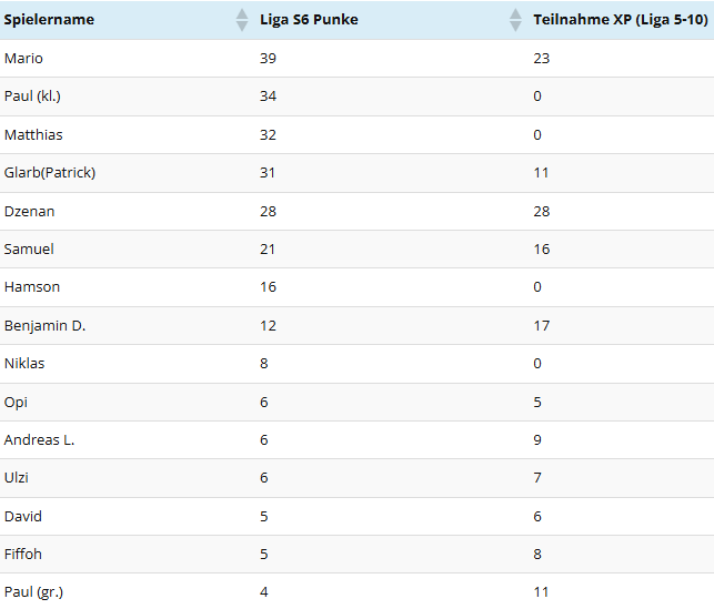 | Spielername | Liga S6 Punke | Teilnahme XP (Liga 5-10) |